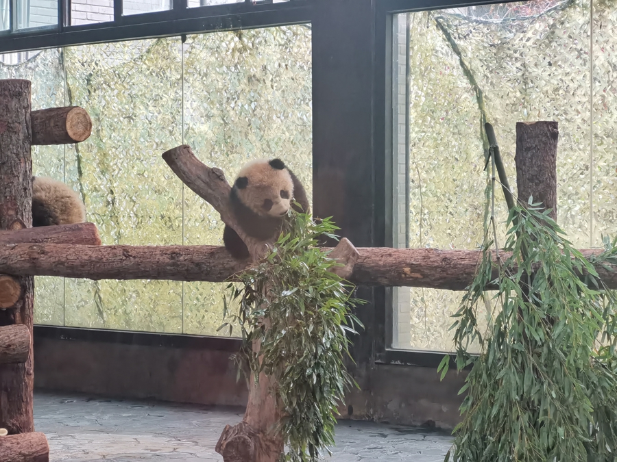“芊然”在它死后的栖架上酷好地向周围放哨,往往拍拍姆妈的背,执一根竹子学姆妈的阵势啃着玩,即使它还没到能啃竹子的时候。