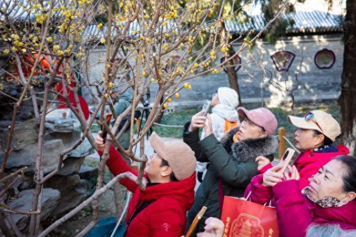 午后的益寿堂前,游东说念主纷繁拍摄腊梅花。