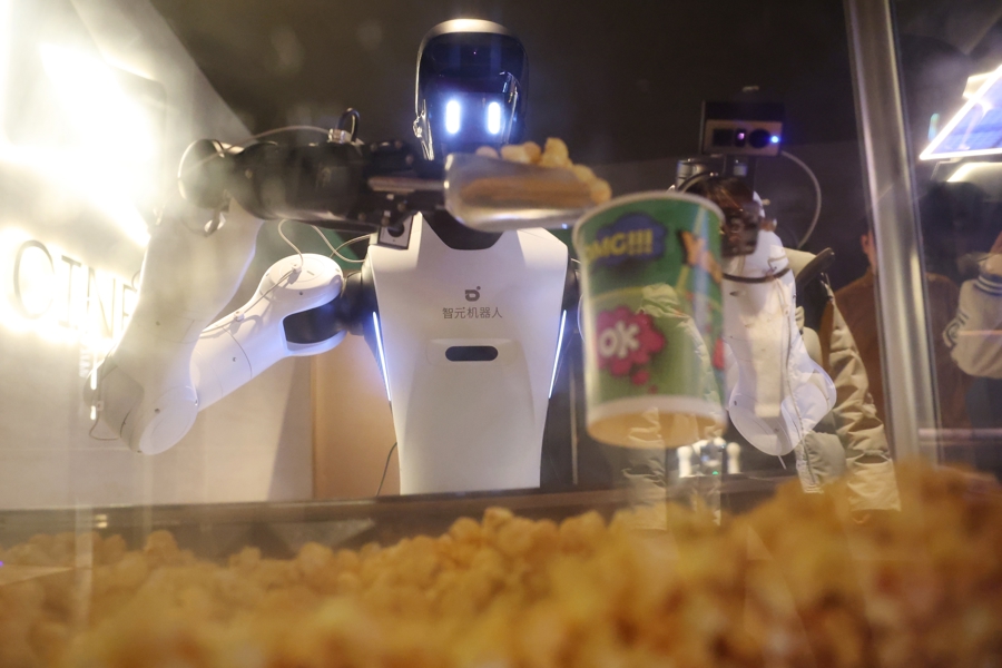 机器东谈主为不雅众提供爆米花配递事业 赖鑫琳 摄
