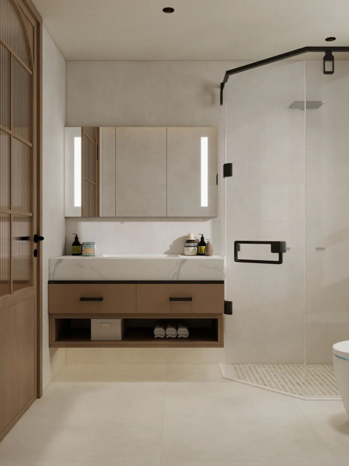 避坑提出:镜柜是卫生间收纳的“神器”! 它能将瓶瓶罐罐无缺荫藏,让台面空无一物。搭配浴室柜的合理分区,再预留一两处通达格(如壁龛或墙面置物架)存放常用物品,才能齐全好意思不雅与实用的无缺均衡。