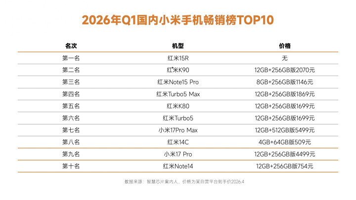 今天共享的是2026年Q1国内小米手机畅销榜TOP10,其中小米17Pro Max名按次七,第又名是红米15R,这款手机应该许多销耗者齐不知谈吧。这份数据开头灵敏芯片案内东谈主,价钱开头于本日某东自营平台的得手价钱,如有疑问可以留言友善讨论,以下是此次榜单的夺目本体。