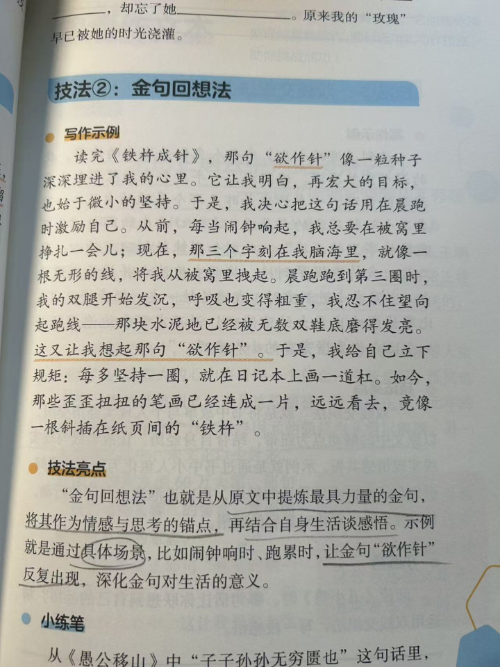 就像《小豆同学同步作文素材》里的例子。有小读者读完《铁杵磨成针》,一直谨记“欲作念针”这三个字,每当跑步想烧毁时,就想起这句话,一会儿混身充满力量,相持完成锤真金不怕火。