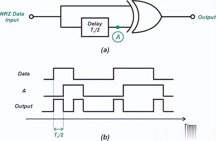 部分贵寓将该电路描写为“将 NRZ 数据调遣为类 RZ 数据”,但它并不可果然生成规范 RZ 数据。举例,当输入荟萃多个 1 的 NRZ 序列时,输出并不会像 RZ 那样在相邻 1 之间往还跳变。