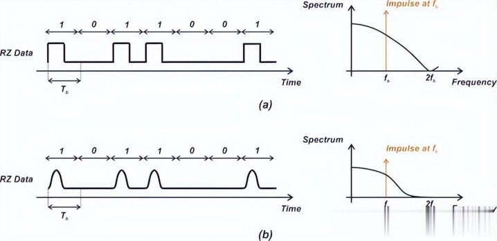 当 RZ 数据通过低通滤波器后,fb 处的尖峰可能会因滤波器反应产生一定衰减,但只消滤波器带宽实足,时域波形仍会在相邻 1 之间归零。此时,频谱中 fb 处的闹翻重量照旧保留。