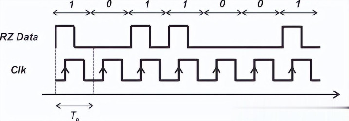 在该编码决策中,比特 1 用高电平表示,而况在比特周期截止前会回到零电平;比特 0 则用低电平表示。信号在相邻的 1 之间会拉低至零,因此得名 “归零码”。