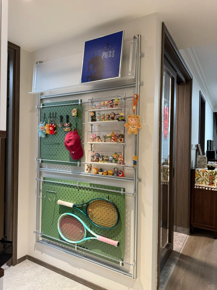不得不说这个铝型材加洞洞板的置物架果真是很酷啊!有 了它,可以展示我方的小青睐,同期还能把我方的不少通常用的默契物品挂起来,拿取都很浅易。