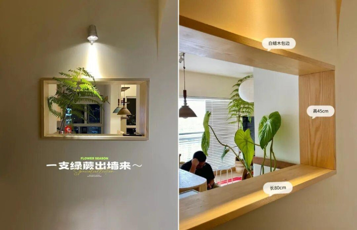 当一面墙上头掏一个或大或小的洞的技巧,这面墙就有了生命,两个空间就达成了连通,就会有令东说念主出东说念主料思的遵循,不只单能点缀空间,更是实用性满满。