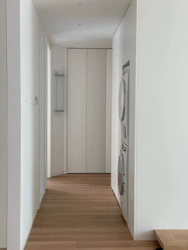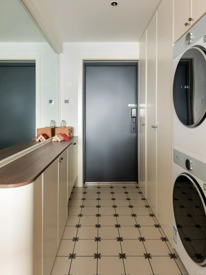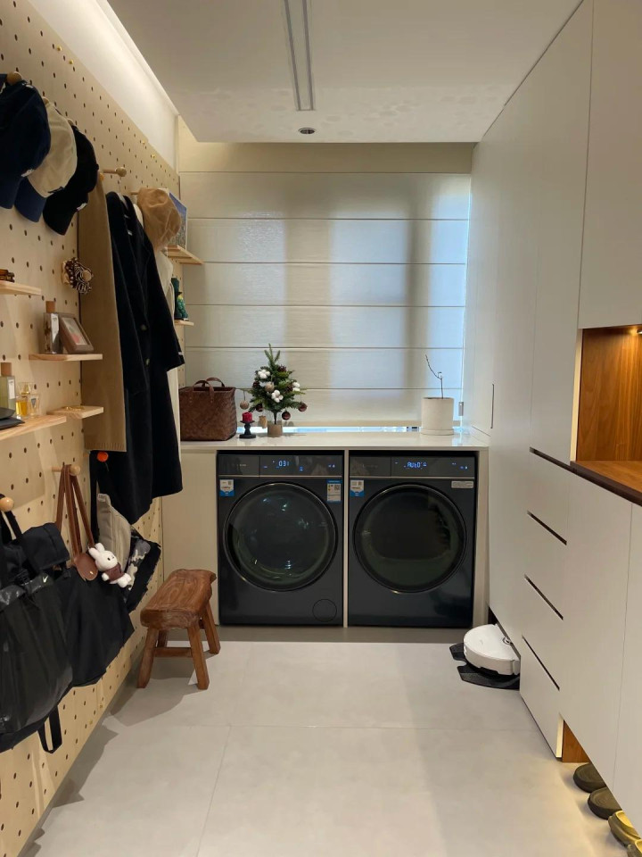 假如有一个挑升沉静的入户玄关,那就更好了,洗衣机、烘干机、扫地机器东说念主、操作台、入户鞋柜、入户杂物玄关皆备在这里惩办,顺带还能晾衣哦!这几乎等于梦中情房啊!
