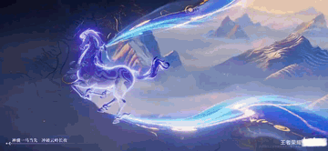 出场动画,神骥一马开头突破云岭永夜,引马超躲藏回望,山峦重复,雾重难行,他飞身上前,率领马群踏征程,越千山。