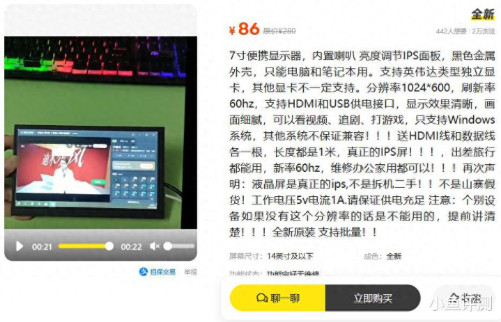 风水轮替转,当今的价钱径直被打下来了,不是腰斩,是径直砍到了脚脖子。今天在二手鱼里闲荡,就看到个狠货,一个老哥挂出来86块钱的7寸便携屏,点进去一看,嚯,一经IPS的。