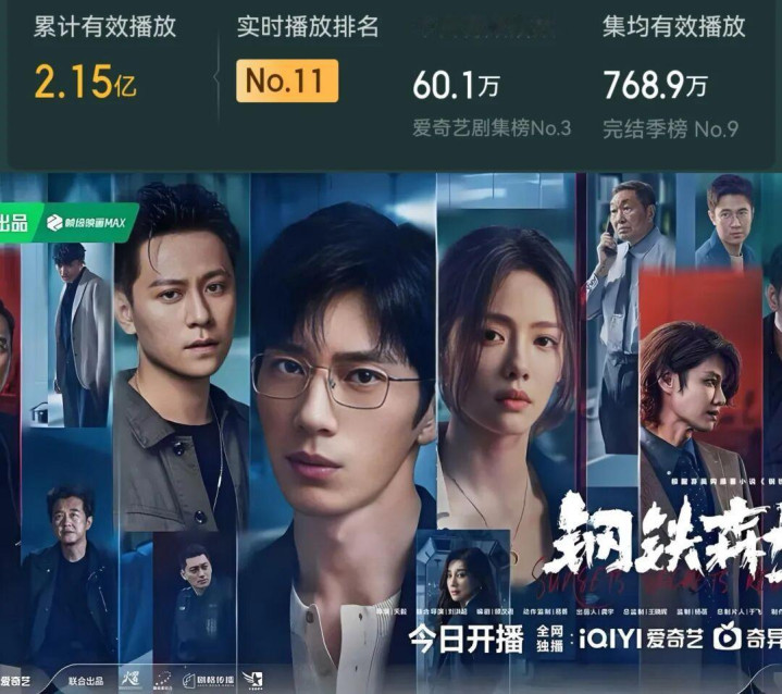 4月3日爱奇艺独播的《钢铁丛林》,井柏然的“娴雅疯批”与秦俊杰的“破灭感”卧底,东谈主物塑造精良且形式张力层层递进。该剧合座口碑“低开高走”,现时集均768.9万、累计2.15亿灵验播放得益,不算太理思。