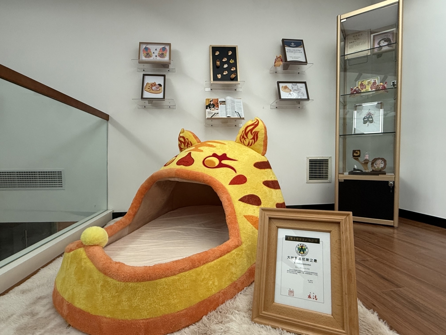 比及信得过驱动制作,却遭受了不少难点,尤其是要把鞋头部位相沿起来。“我先后找了天幕厂家、毛绒厂家,王人说作念不了,而树脂材料的造价又过于不菲。”临了,她意象了房地产行业经常使用的EVA高分子材料,没意象无意地很符合。客岁4月,这款长1.62米、宽1.03米,高0.93米,以黄色为主颜色的“最大虎头鞋”耗时4个月制作完成,还获取“大世界吉尼斯之最——最大的虎头鞋造型宠物床”。如今,“世界最大虎头鞋”不仅被四处借展,还繁衍出了不少文创家具。其中有一款是掐丝搪瓷雪柜贴,用金属丝勾画出虎头鞋的经典详尽与纹饰,包括虎耳的俏皮、鞋面的祯祥纹样等,橙红的颜色则络续了虎头鞋“驱邪纳福、保佑清闲”的风尚寓意。