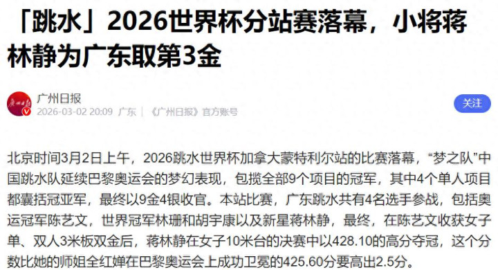 接力总不缺讲演,11岁拿下寰宇少儿跳水比赛三项冠军,12岁过问省队,同庚入国度队。