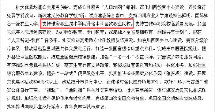 其中,2026年雅安市东谈主民政府职责讲演提到:支持四川农业大学开拓本性赫然、国外有名一流农业大学,支持雅安管事时候学院升格本科档次管事院校,支持在雅中职院校高质料发展。