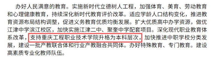 此外,2026年重庆市江津区东谈主民政府职责讲演提到:深远当代管事稳重体系修订,支持重庆工程管事时候学院升格为本科档次,加速鼓动中职学校分类发展,开拓一批产教集会体和行业产教交融共同体。